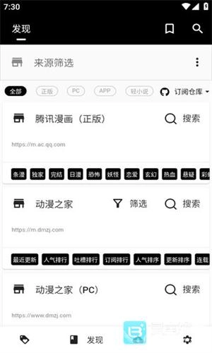 7、提示订阅成功后,在发现页就能看到不同的漫画平台了,这时就说明我们已经成功导入了漫画资源