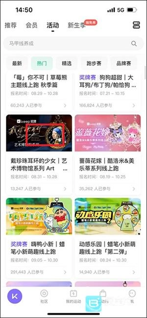 1、启动Keep应用,进入用户推荐的首页界面,点击顶部导航栏里的“活动”选项;