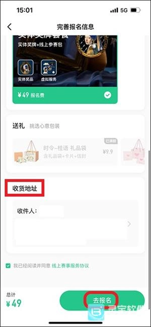 4、进入到完善报名信息页面,选择活动时间、活动组别、奖牌套餐以及收获地址信息,勾选下方的“同意协议”按钮,再点击“去报名”按钮;