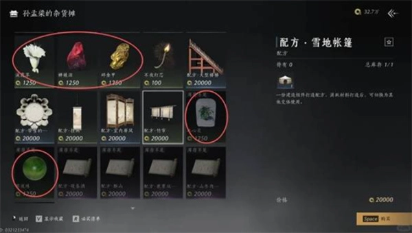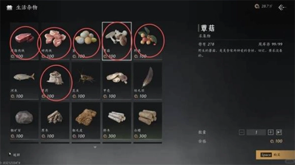 同样以生活材料为主,涵盖做菜与制药所需物品。无硬性必买内容,根据自身生活技能路线自由购买。