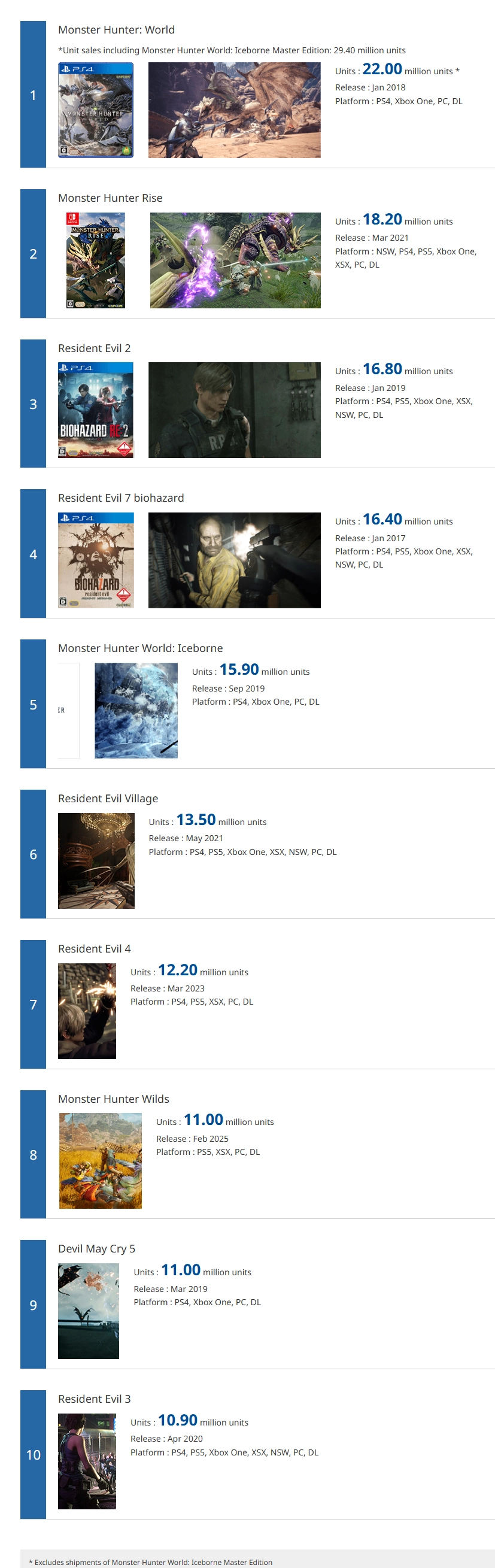 其他畅销作品还包括:《生化危机2重制版》(1680万份)、《生化危机7》(1640万份)、《鬼泣5》(1100万份)以及《生化危机3重制版》(1090万份)。于2024年发售的《龙之信条2》销量已突破410万份。此外,《漫威VS卡普空格斗收藏集》作为经典合集也成功跨入百万销量门槛。