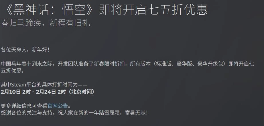 为迎接马年春节的到来,国产动作游戏《黑神话:悟空》今日正式推出新春限时折扣活动,PC平台(Steam、Epic、Wegame)的所有版本即将开启七五折优惠。