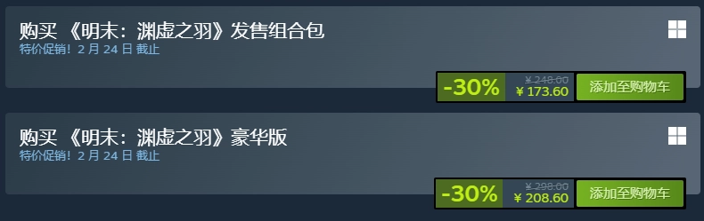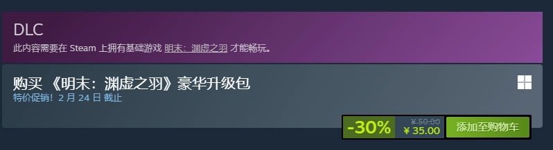 此外,《明末:渊虚之羽》豪华升级包也在打折中,售价为35元人民币。