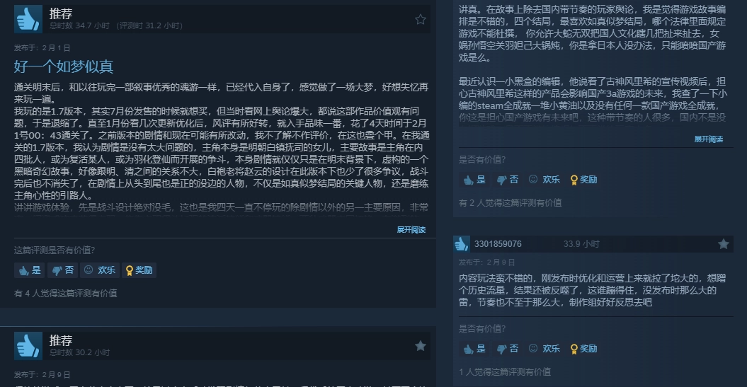 《明末:渊虚之羽》Steam近期好评率高达82%,多数玩家给出了好评。