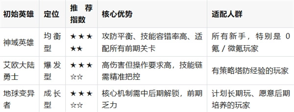 2、结论:无论你是什么类型的玩家,神域英雄都是初始选择的唯一答案,能提供最稳定的前期过渡和最高容错率。