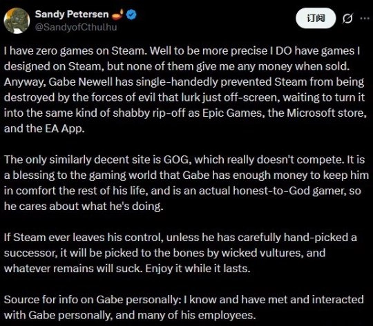 近日,曾参与《毁灭战士》《雷神之锤》设计工作的Sandy Petersen发布推文,明确表达了对Steam创始人Gabe Newell的支持,他盛赞Gabe Newell“差不多是凭借一己之力守护住了Steam”。
