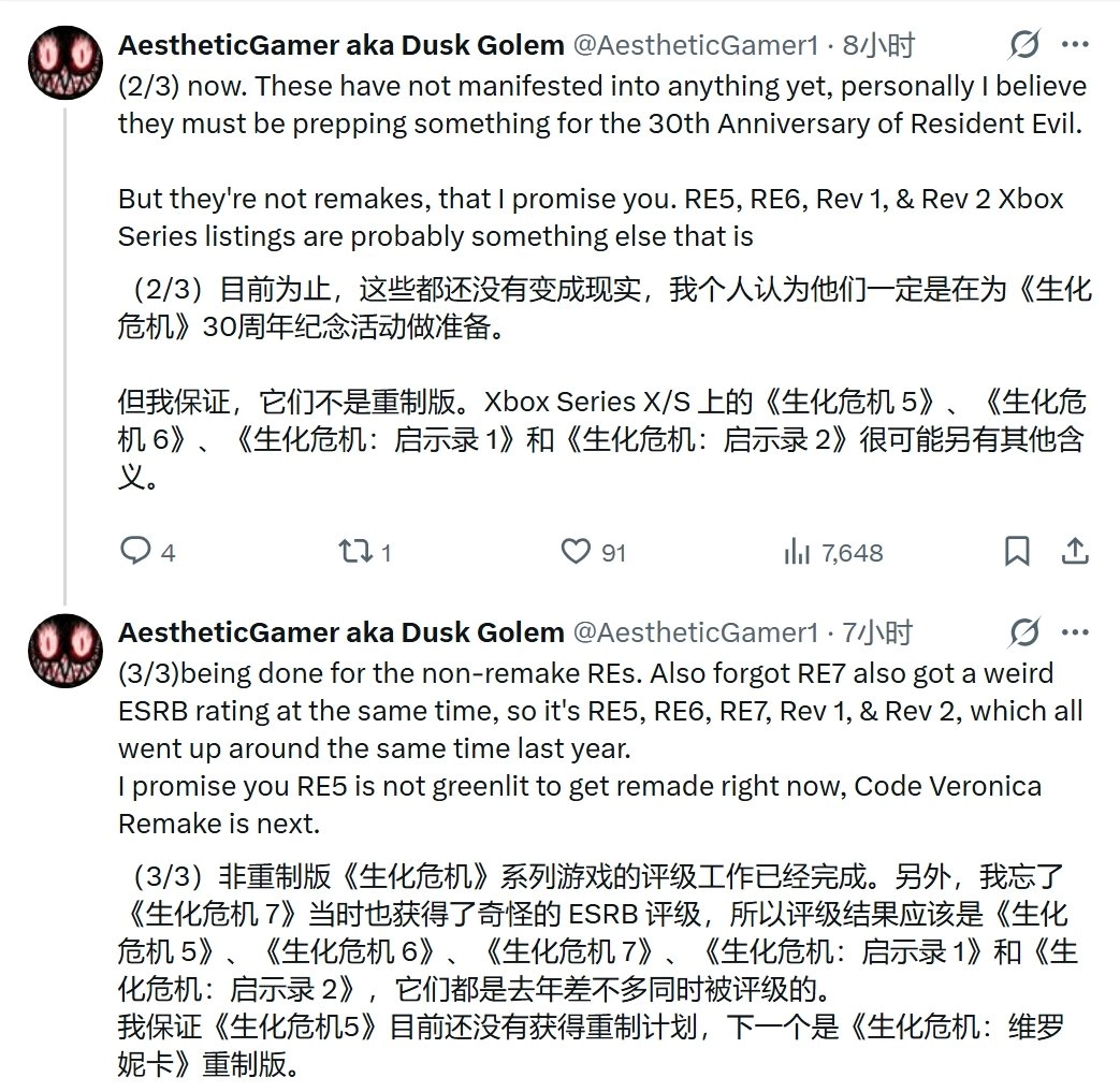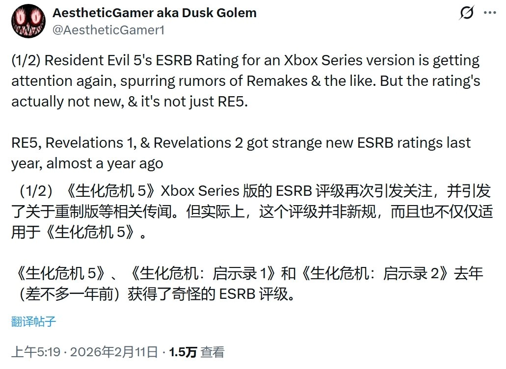 近日,《生化危机5》Xbox Series版本获得ESRB评级的消息,让玩家再次聚焦该作是否会推出重制版。不过,业内人士Dusk Golem澄清称,这些评级并非针对重制版——相关评级早在去年就已出现,涉及《生化危机5》《生化危机6》《生化危机7》及《启示录》系列等多部作品,推测可能是为《生化危机》系列30周年做的筹备工作,但绝非重制版计划。他进一步强调,目前《生化危机5》尚未启动重制立项,接下来的重点其实是《代号维罗妮卡》的重制版。