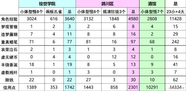 小体型怪:哀荣泣石(紫),丰饶香涎(蓝),虚数残叶(绿),陨铁(绿),324或432点角色经验;