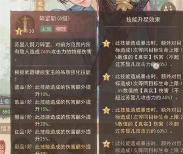 1、兵种技能点完,直接冲四技能!这个技能效果很直白,就是提升物理伤害,和苏显儿的输出定位完美契合,属于实打实的伤害加成。