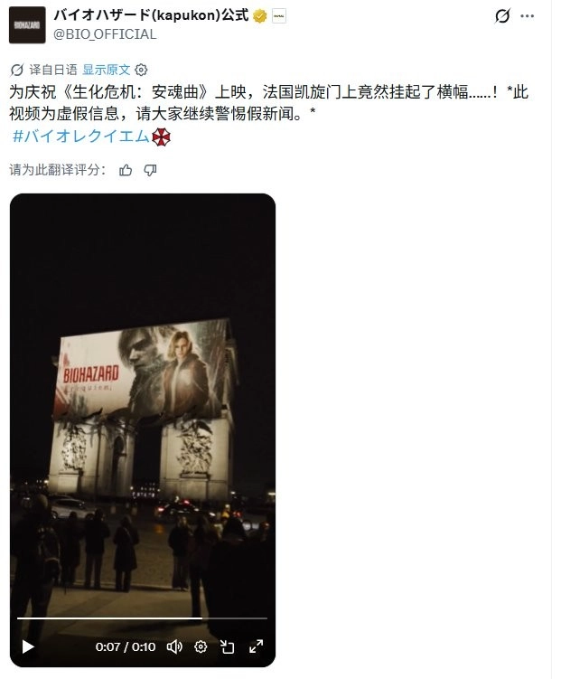 《生化危机:安魂曲》大幅广告现身法国凯旋门 官方否认系AI生成