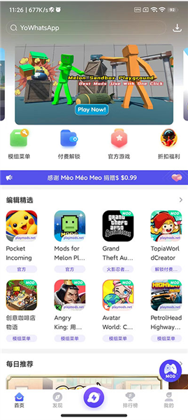 1.首先在本站安装好playmods中国大陆开放版,进入到主页面便能看到海量的游戏内容和资源