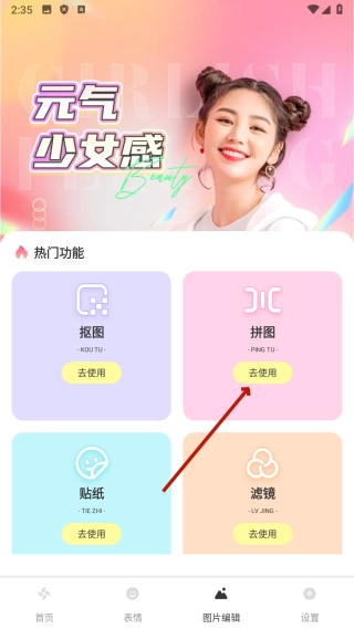 2. 在图片编辑功能界面,点击【拼图】选项,即可进入图片选择界面。