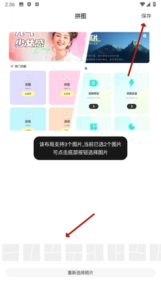 4、于拼图编辑页面,选中【选择拼图布局】,随后点击【保存】,就能完成拼图制作并加以保存。