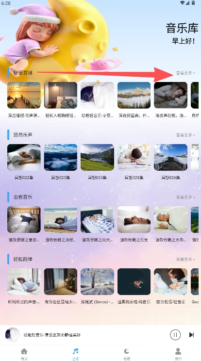 2、在音乐库中找到“舒缓音调”分类板块,点击右侧的“更多”文字链接进入列表。