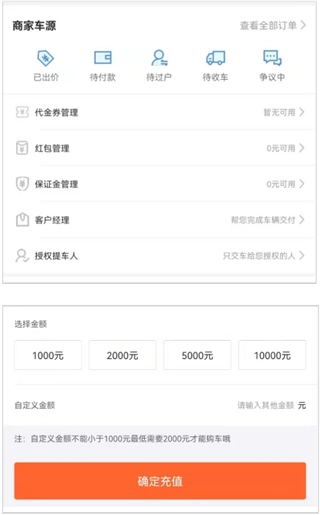 2、然后需要充值保证金,只有充值保证金才能参与车辆拍卖,在我的界面中,点击保证金管理,选择完金额之后,点击充值即可;
