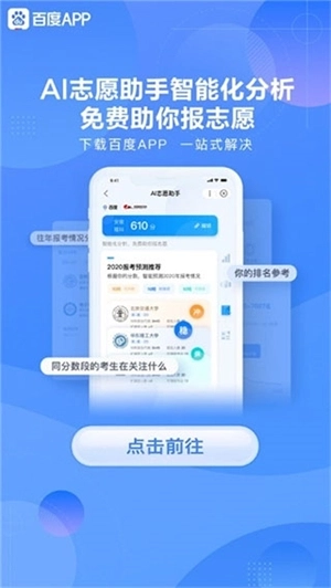 2025最新版的百度AI志愿助手是一款基于智能技术开发的志愿填报软件。它具备多种功能,如大数据搜索、个性化定制、分数查询和学院查询等。这款软件能够根据学生的兴趣爱好及性格特点等因素,推荐最适合的专业选择方案,从而简化了志愿填报的过程,帮助学生轻松找到自己满意的专业和大学。