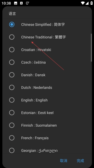 4、在语言选择界面,选中【繁體字】选项,这样就能把应用语言设定为繁体中文。