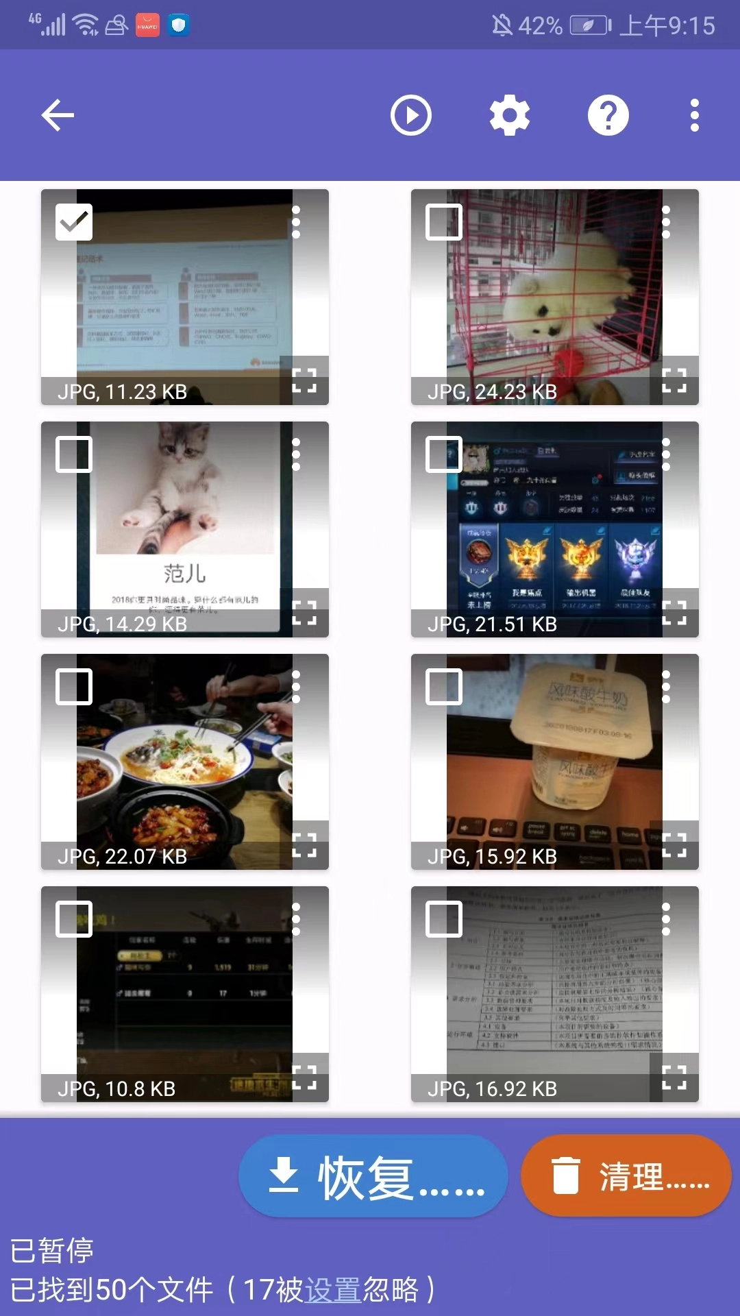 3、我们可以随时点击暂停,然后勾选需要恢复的照片,