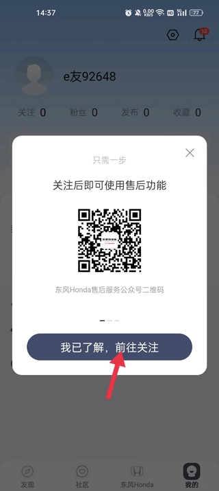 请先在弹出的提示中选择允许,接着用微信扫码关注东风本田售后服务的官方公众号,完成关注后回到当前页面,找到绑定微信的选项并点击允许,即可进入下一步操作。