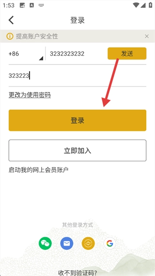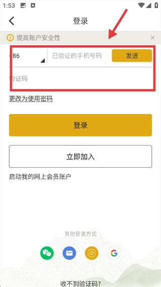 输入手机号和验证码。