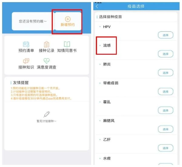 添加“新增预约”选项,选择“流感”类型,完成流感疫苗的“预约接种”操作。