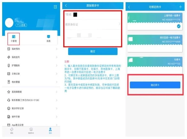 打开“闵行捷医”应用,点击底部导航栏的“我的”选项,进入个人中心页面后找到“卡管理”入口,接着选择添加“闵行区统一自费就诊卡”并完成绑卡操作。