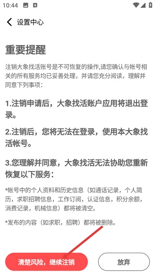 在重要提醒页面,仔细阅读相关事项后,点击【清楚风险,继续注销】按钮,系统会弹出确认提示框。