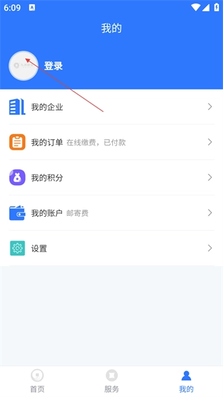 在个人页面点击登录入口,即可进入登录界面,通过该界面能够查看我的企业、我的订单等相关信息。