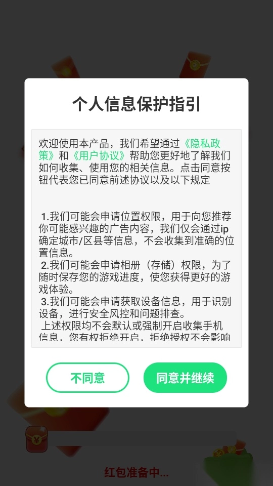 首先打开软件,阅读“个人信息保护指引”,之后点击“同意并继续”按钮进入下一步。