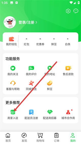 在个人中心页面,找到并点击【商家入驻】选项,即可进入京东外卖商家入驻页面。