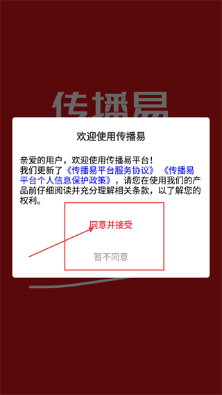 在传播易的用户协议界面,点击“同意并接受”按钮,即可继续使用平台服务。