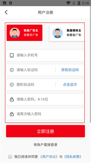 在用户登录界面,要是还没有账号,点击【立即注册】按钮,就能进入注册页面。