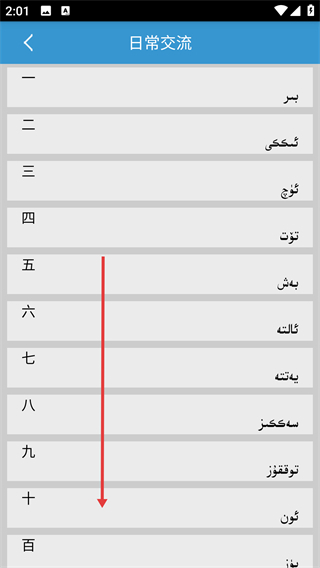 在日常交流词汇列表页面向上滑动屏幕,浏览词汇。