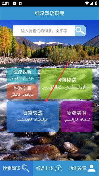 在维汉双语词典的首页找到【日常交流】这个选项并点击,就能进入到日常交流词汇的列表页面了。