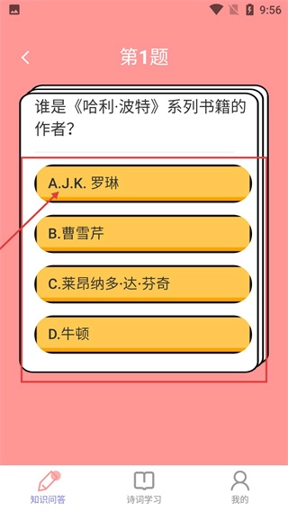 在知识问答的第1题页面,依据题目内容挑选出正确选项,例如对于“《哈利·波特》系列书籍的作者是谁”这一问题,应选择A选项的J.K.罗琳。