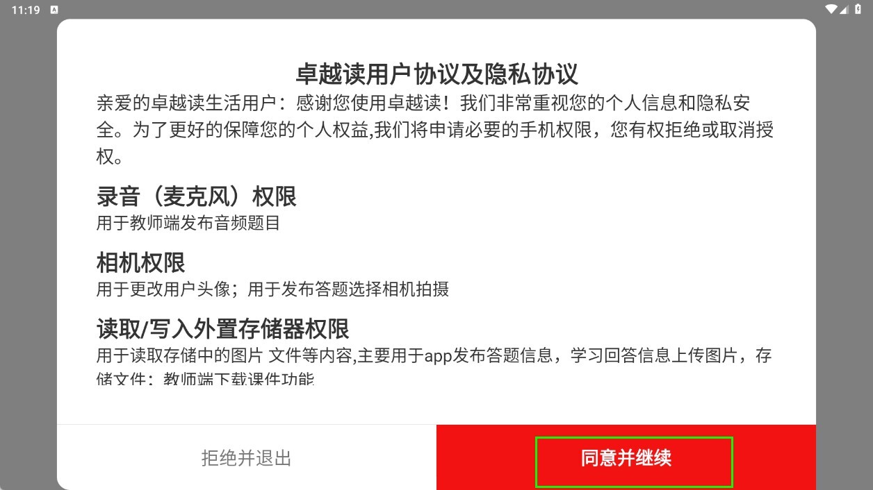 点击【同意并继续】按钮,以确认您同意卓越读的用户协议和隐私协议。