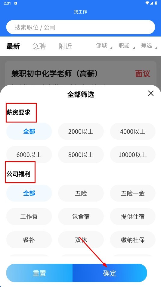 在求职页面能够设置薪资期望、企业福利等筛选条件,点击【确定】功能按钮即可应用筛选。