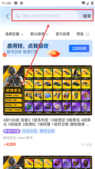 在商品搜索页面的搜索框里输入关键词,像“100级”这样的内容。