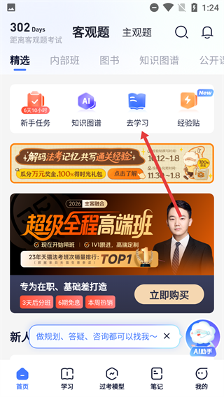 在首页找到并点击【去学习】按钮,即可进入学习板块,正式开启法考知识的学习流程。