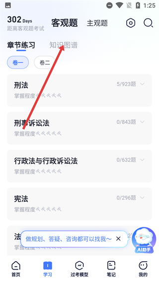 在学习页面中找到并点击【知识图谱】标签,即可切换到知识图谱页面,在该页面能够按照学科分类查看各个知识点。