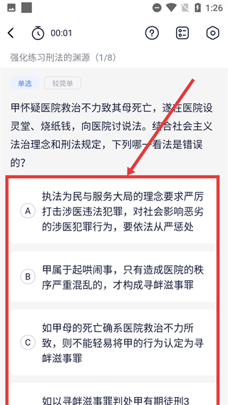 在知识点练习页面,你能够查看A、B、C这类题目选项,通过练习法考题目来巩固相关知识点。