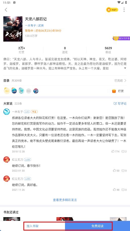 在武侠类书籍中选择《天龙八部后记-书籍名称》,进入该书的详情页面后,点击【免费阅读-功能按钮】即可开始阅读。