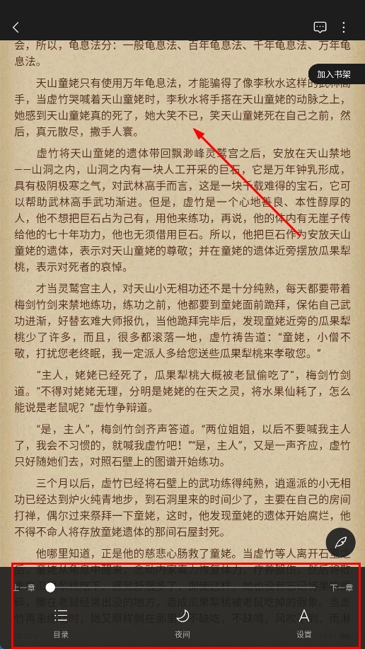 进入阅读页面后,不仅能浏览书籍内容,还可以借助底部的功能栏完成目录查看、夜间模式切换以及设置调整等操作。