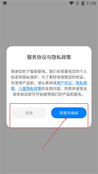 在服务协议与隐私政策页面,点击【同意并继续】按钮,即可进入应用的主界面。
