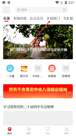 在新闻首页找到并点击【乡镇部门】选项,即可进入乡镇部门新闻列表页面。