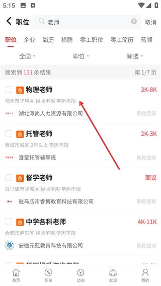 在职位搜索界面输入目标职位名称,如“老师”。
