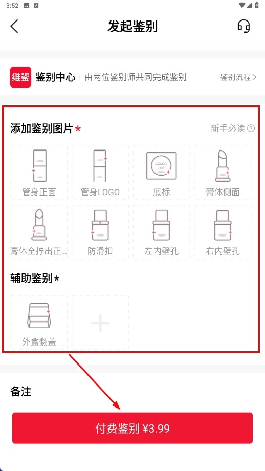 在发起鉴别页面,添加好鉴别图片与辅助鉴别图片后,点击【付费鉴别¥3.99】功能按钮,即可完成鉴别流程。