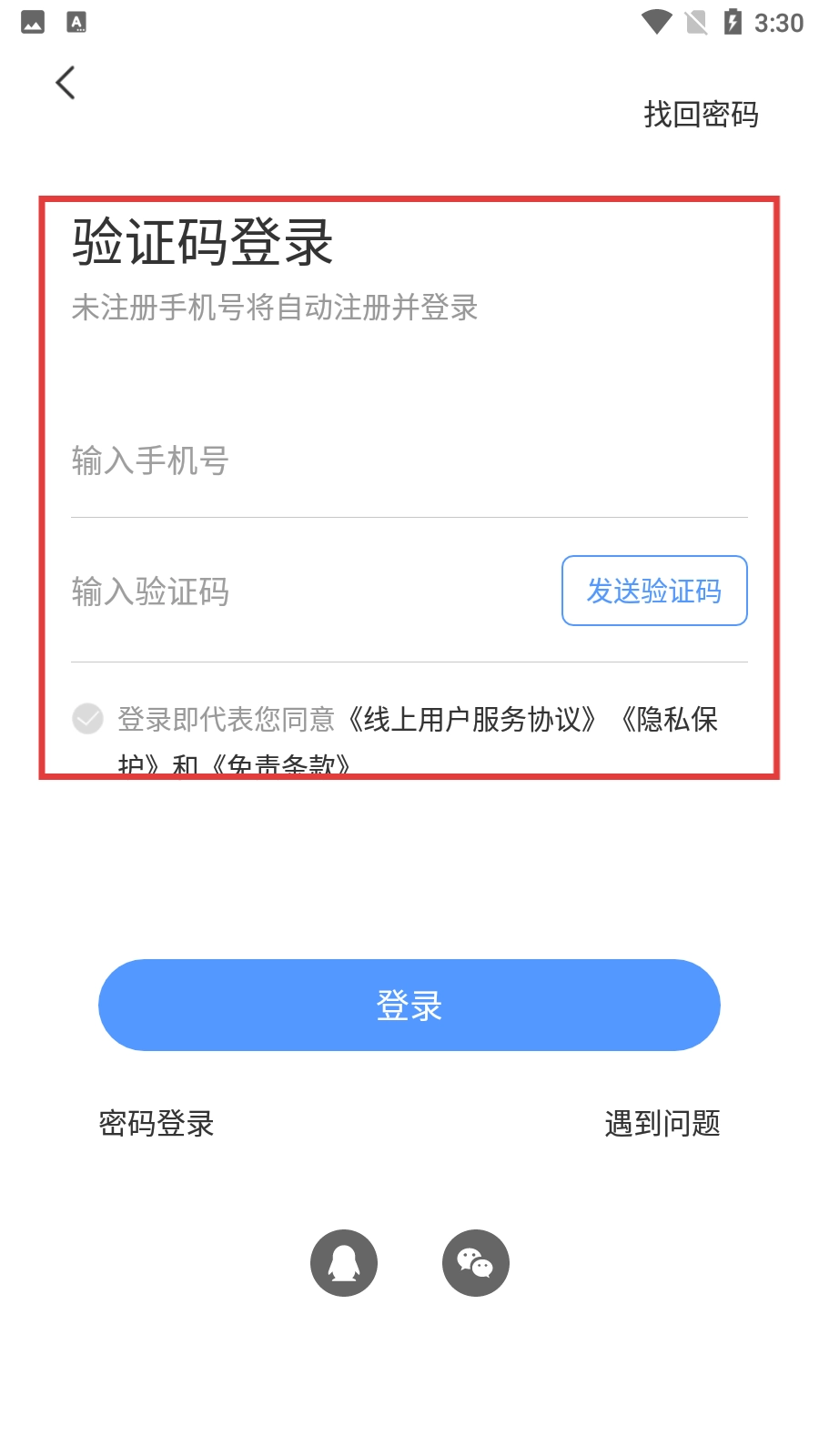 在登录界面,用户可以选择验证码登录方式,接着输入手机号并点击获取验证码,随后勾选相关协议,即可完成登录前的准备操作。