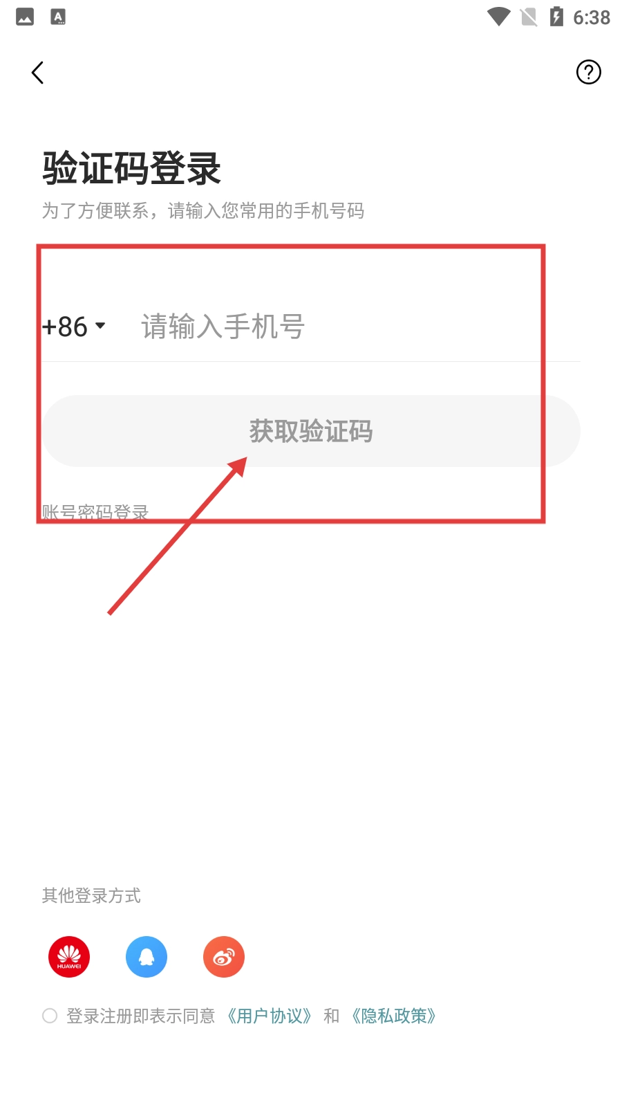 请输入手机号码,接着点击【获取验证码】按钮,为登录操作做好准备。
