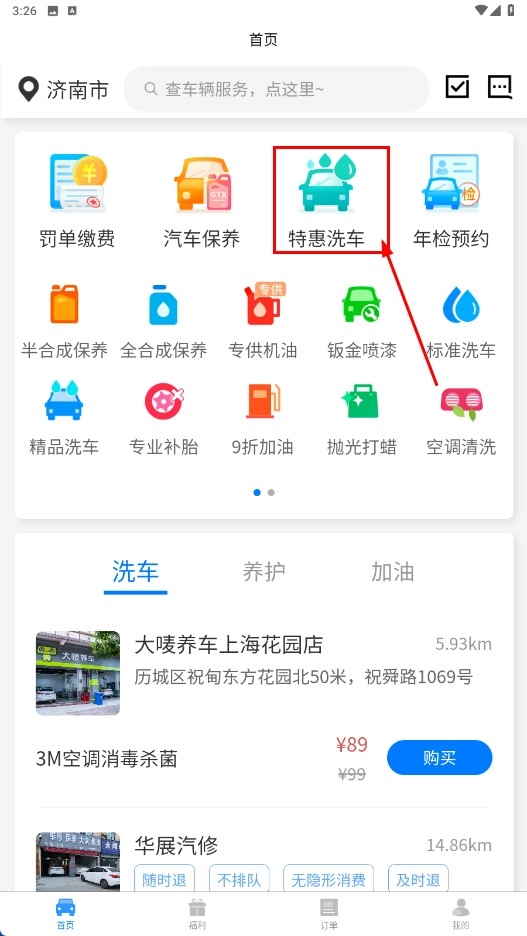 点击【特惠洗车】功能按钮,即可进入对应的服务页面,同时也能选择其他汽车服务功能。